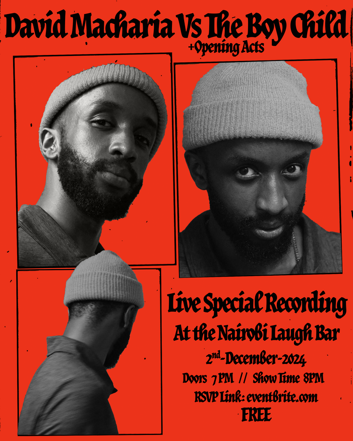 Event poster promoting a standup comedy special recording featuring David Macharia at the Nairobi Laugh Bar.