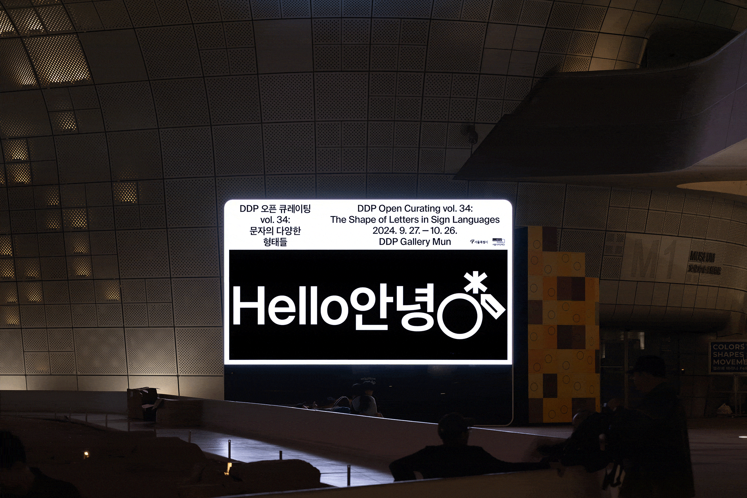 Selected for the Seoul Design Foundation’s DDP Open Curating program and hosted by Gallery MUN at DDP (Dongdaemun Design Plaza), the exhibition presented research into sign language as a new typographic element. The exhibits are based on typography methods that use layout, color, proportion, and movement within a set system. We created the visual identity, translating manual gestures into graphic motifs.