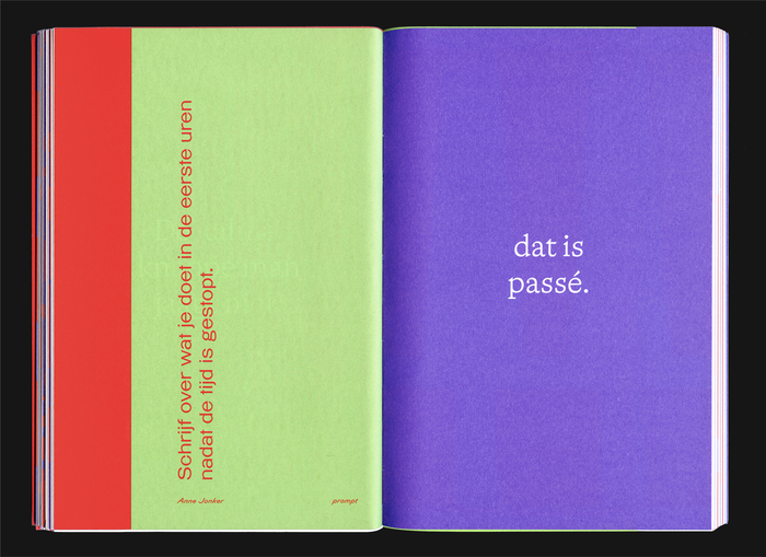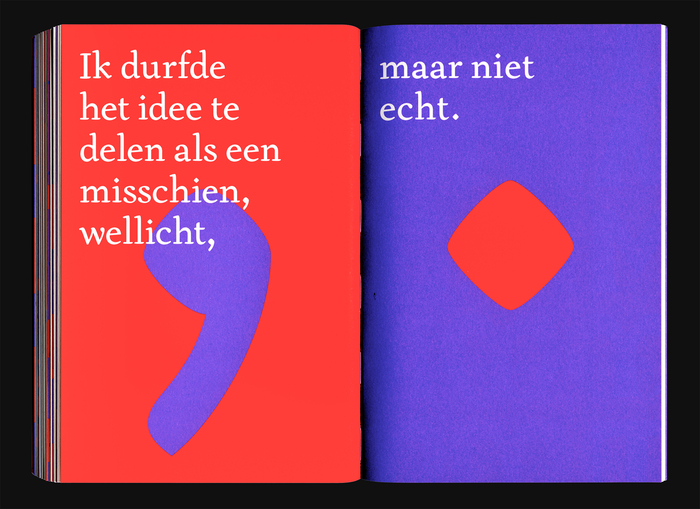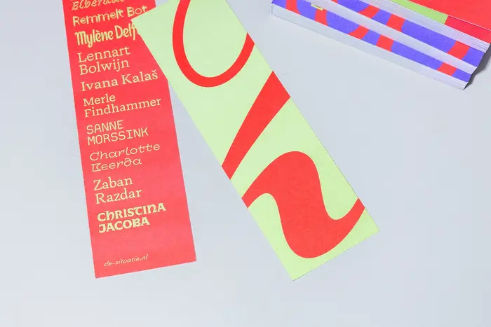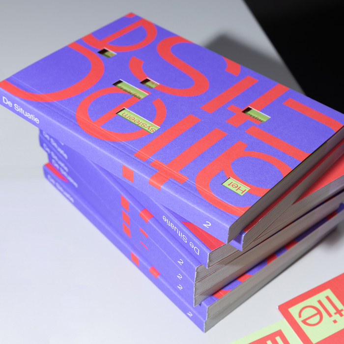 The texts are interspersed with half pages that are tilted in the reading direction, inspired by the dwarsligger concept—originally designed to make books readable with one hand. Within the context of De Situatie, this device also functions symbolically, reflecting the platform’s slightly off-axis position within the literary landscape. All editorial texts are placed on these half pages, reinforcing the relationship between form and content.