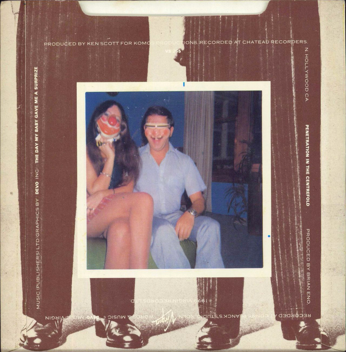 The back cover mentions the title of the B-side, “Penetration in the Centrefold”, and credits the graphics to Devo, Inc. The wide all-caps sans is some derivative of Blair (but not ITC Blair), possibly Amsterdam Card Grotesque, which is Photo-Lettering’s adaptation of Kaart-Antieke. The bold style is Univers.