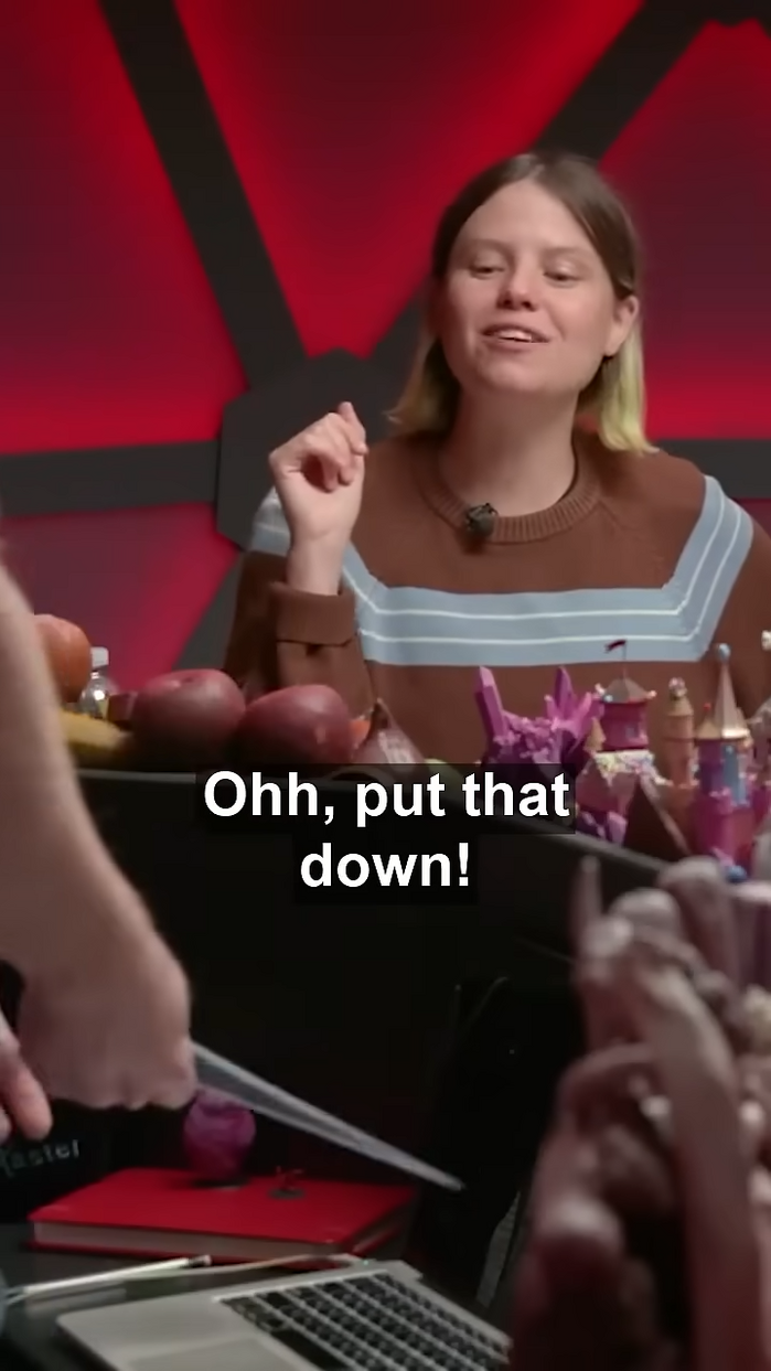 Clip from Dimension 20: A Crown of Candy. Ally Beardsley’s quote “Ohh, put that down!” is set in Arial.