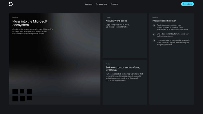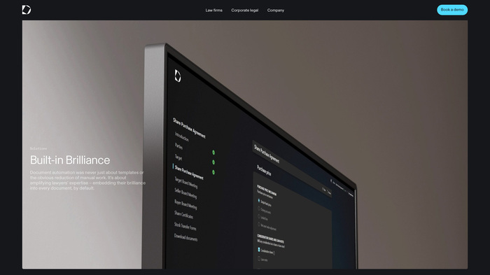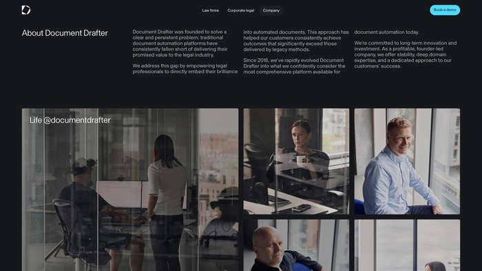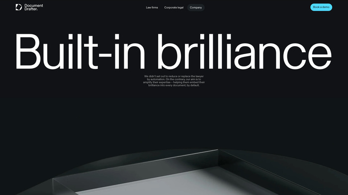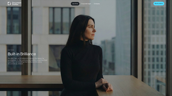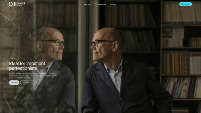 Document Drafter is a Danish document automation platform for law firms and corporate legal teams. The website frames automation as a way of embedding legal expertise into documents rather than reducing it to templates, using lines such as “Ideal for impatient perfectionists” and “Built-in brilliance”.