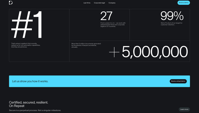Product sections focus on Word-native drafting, Microsoft integration, end-to-end workflows and Agentic AI, while customer logos, security certifications, metrics and testimonials build trust across a technical B2B sales flow. The company page adds a founder-led profile and Danish locations in Copenhagen and Aarhus.