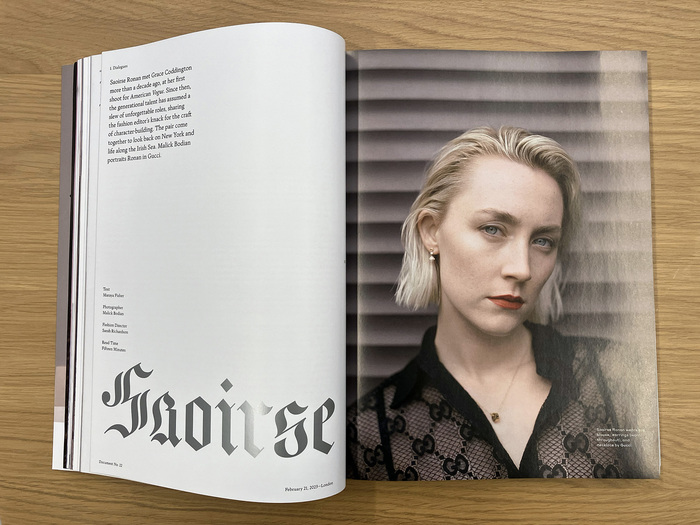 Both styles of Seance are featured; Seance Graphic introduces the numbered chapters and appears (alongside Nicola Display) in article titles in the back portion of the magazine, while Seance Ornate is used for opening spreads in the main feature well. Most of the display type is printed in metallic silver ink to further contrast with the text and captions.
