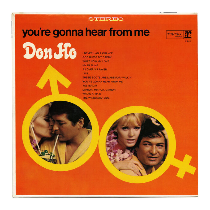 You’re Gonna Hear From Me is one of three albums that Hawaiian crooner Don Ho (1930–2007) and his backing group The Aliis released in 1966. The cover design featuring photos of Ho and a blonde woman enclosed in male and female signs is by Ed Thrasher.