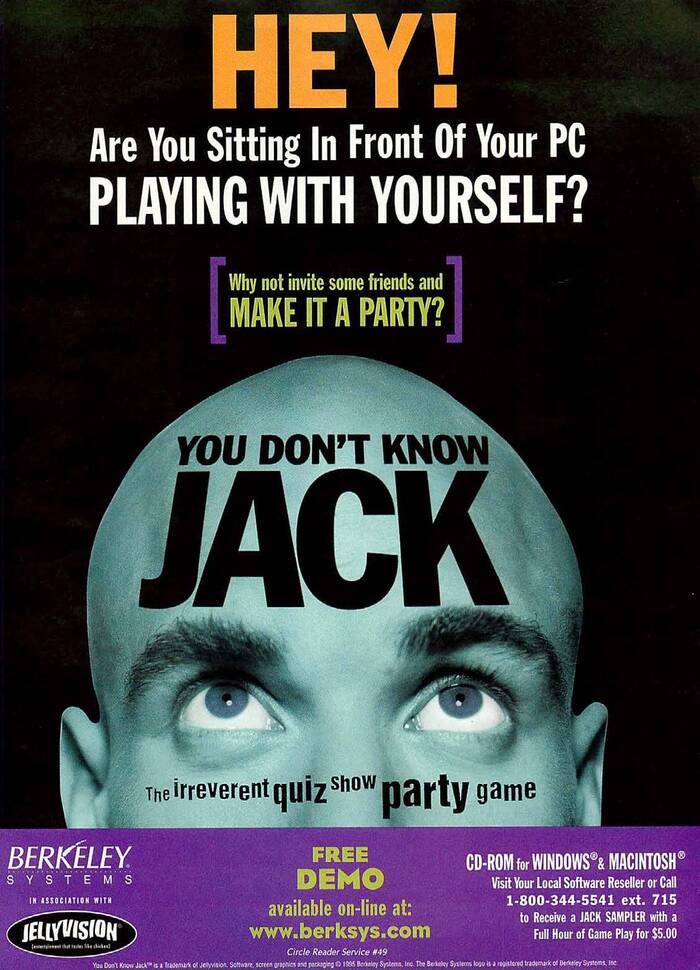 You Don’t Know Jack is a series of video games developed by Jackbox Games (formerly known as Jellyvision Games) and Berkeley Systems, as well as the title of the first You Don’t Know Jack game in the series. You Don’t Know Jack, framed as a game show “where high culture and pop culture collide”, combines trivia with comedy.