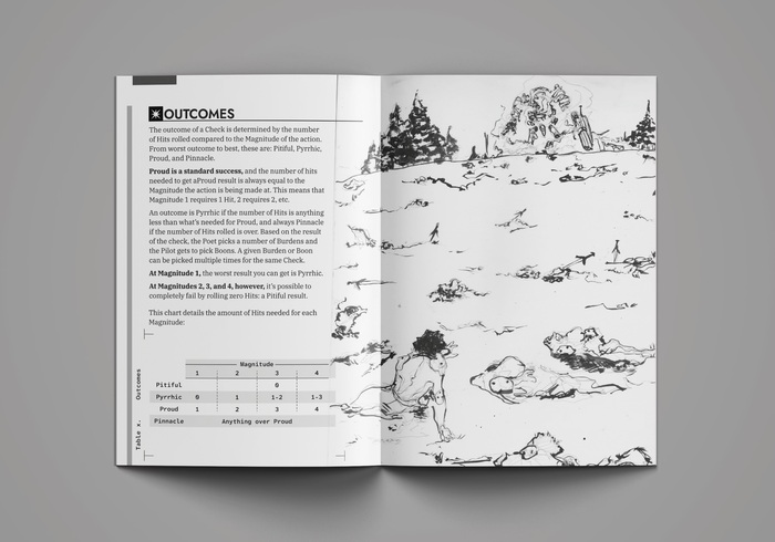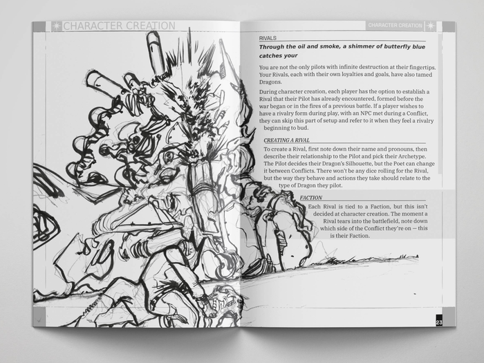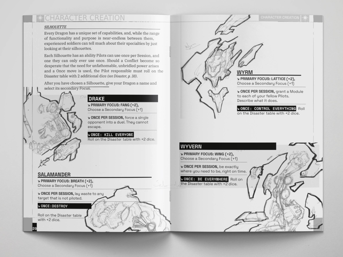 The team tasked me with mixing the style of military guides and documents, with elements from mecha anime and medieval manuscripts. The zine seeks to look slightly chaotic and unrefined, as if it was a document that has been photocopied and annotated by the characters. Small decorations lifted from medieval codices were used through out the book, along the black and white illustrations by Emma Harvey.