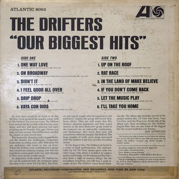 Back cover for Our Biggest Hits. “THE DRIFTERS” and “‘OUR BIGGEST HITS’” are set in Haas Inserat-Grotesk / Neue Aurora VIII (width stretched to 150%). The track list is set in Anzeigen-Grotesk / Neue Aurora IX, with side headers in Grotesque No. 9 (italic) and the writing credits underneath each track set in News Gothic (italic). The liner notes, written by Bob Altshuler, are set in Primer (normal, with song and album titles in italic). The credits, including a typo regarding the catalog number of Save the Last Dance for Me (as Atlantic’s 8000 series only went up to 8305), are also set in Primer (italic). The address info is set in Clarendon.