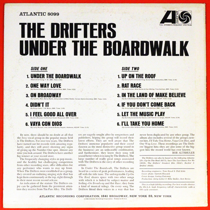 Back cover for Under the Boardwalk. Mostly the same as Our Biggest Hits, except for “‘OUR BIGGEST HITS’” being replaced with “UNDER THE BOARDWALK”. The track list is also different: “Drip Drop” is removed and replaced with “Under the Boardwalk” as the opening track. The catalog number typo in the credits has been fixed.
