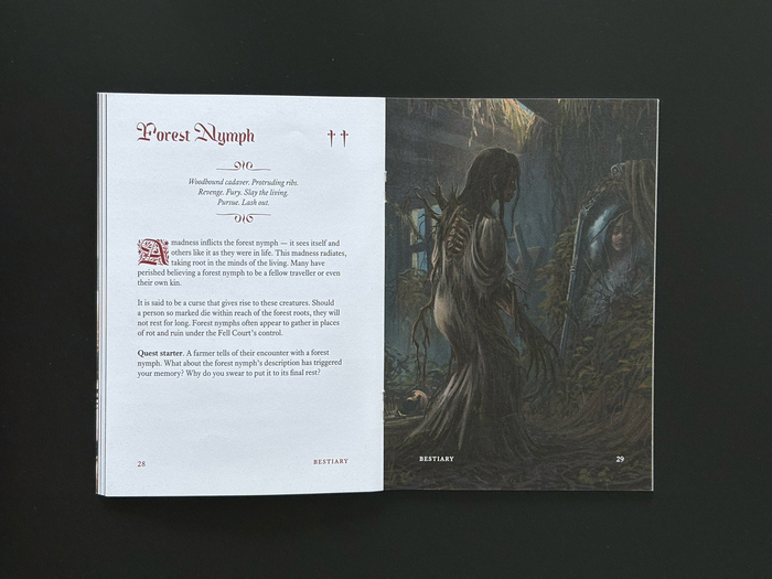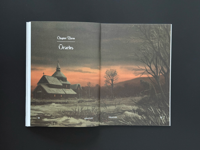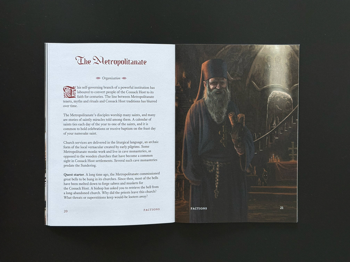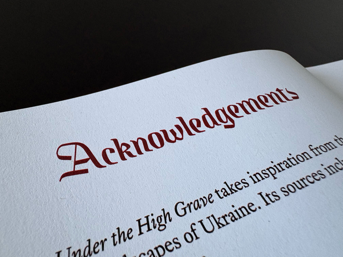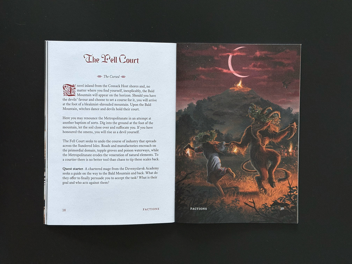The Kingfall typeface is used for headlines, initials, and chapter decorations of the manual book for the tabletop role-playing game from Mendercap. Dwellers Under the High Grave is a 56-page setting for the Ironsworn family of games, and Sundered Isles in particular. It draws inspiration from the early modern history, folklore and landscapes of Ukraine. Writing and layout by Michael Chumak, with illustrations by Roman Dubina. The text typeface is Equity.