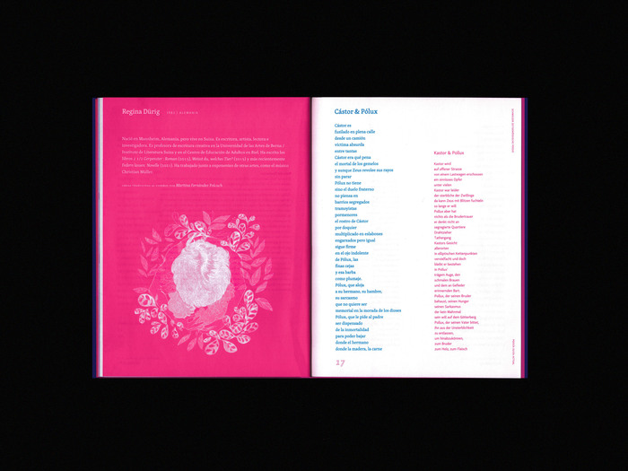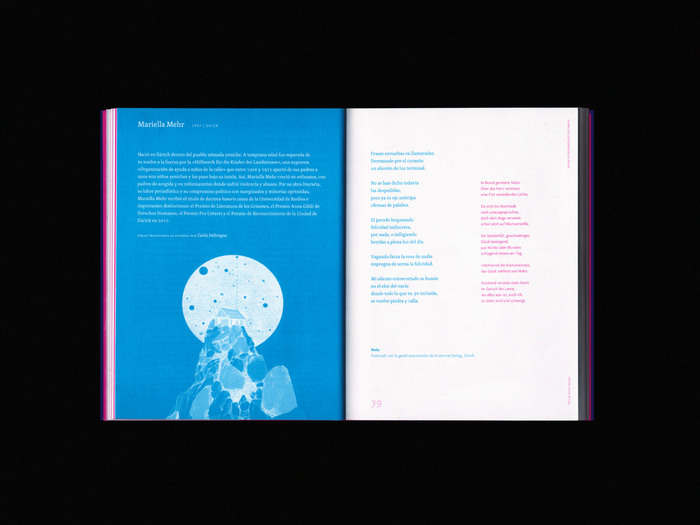 In 2021, a unique anthology of contemporary Swiss poetry was published, featuring works written in the four official languages of Switzerland: German, Romansh, French, and Italian. This collection seeks to create a dialogue between Switzerland and Latin America, delving into common themes, exploring differences, and weaving a narrative that connects two continents through the power of words and poetry. The anthology offers a space for reflection on identity, territory, and the shared human experience. Printed in two distinct inks, magenta and cyan, the book stands out visually as much as it does intellectually. The illustrations, crafted by Colombian artist Marcela Quiroz, add an extra layer of depth, visually amplifying the poetic voices within the pages. This fusion of language, art, and culture not only celebrates the literary richness of Switzerland but also underscores the importance of intercultural exchange, making the work an evocative bridge between two diverse worlds.
