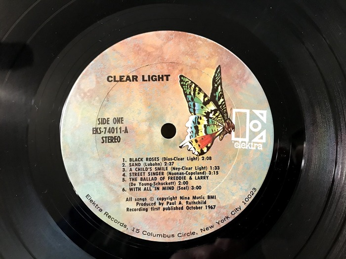 Label for Clear Light’s 1967 self-titled album (circa 1970-1973 reissue). This label design, which features a butterfly carrying the E by its stem (alongside a 7″ design featuring a caterpillar), was first used in August of 1970 on Josh White's The Best of… album.