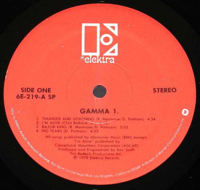 Label for Gamma’s 1979 self-titled Gamma 1 album. This label design, which is similar to the 1969–1970 design (only used on two LPs) but with a smaller logo, was first used in 1979 on Nino Rota’s soundtrack album for the film Hurricane.