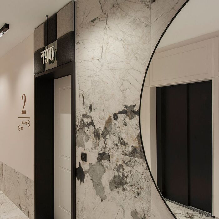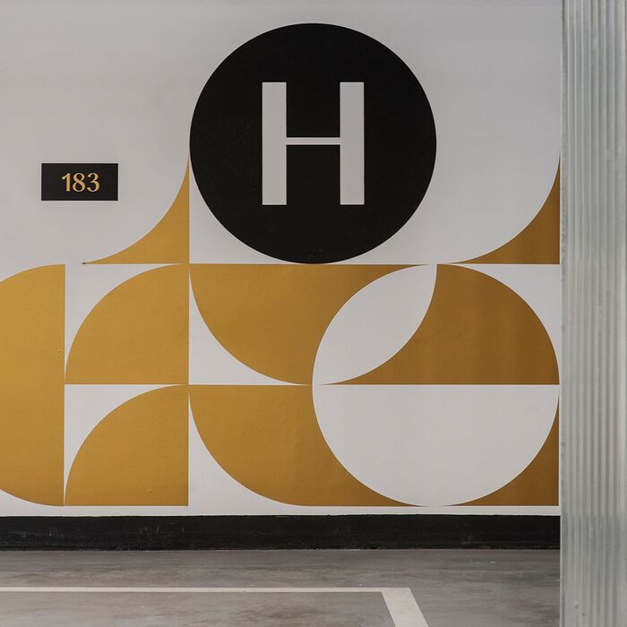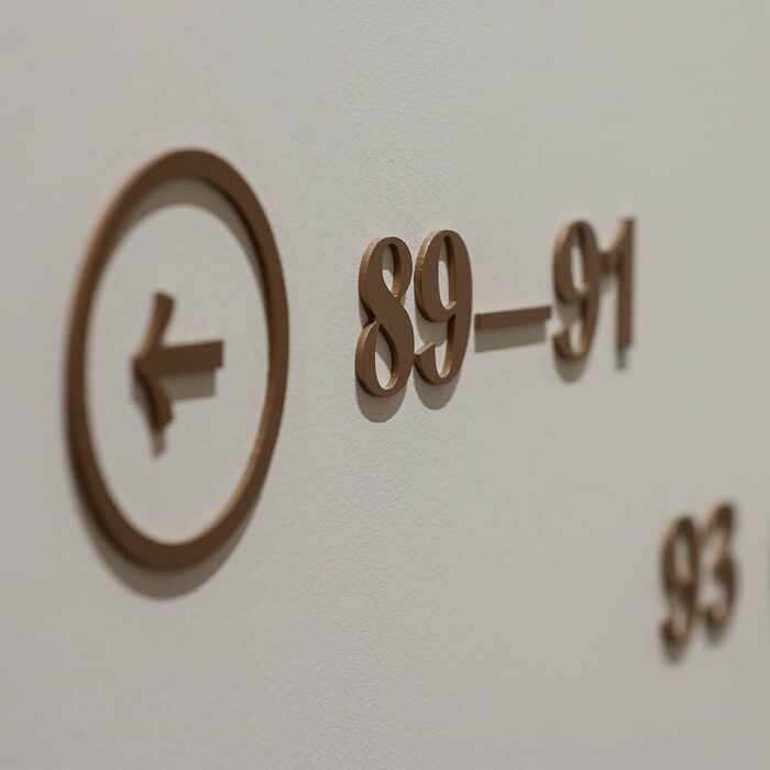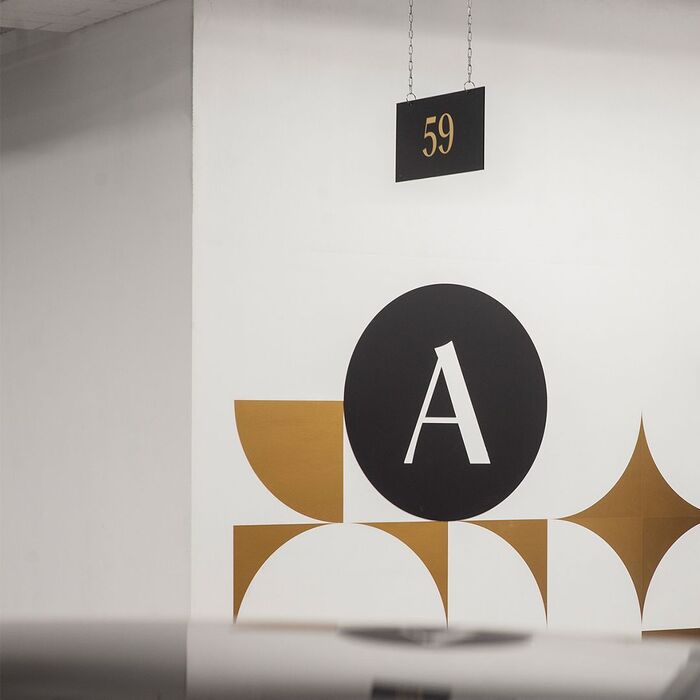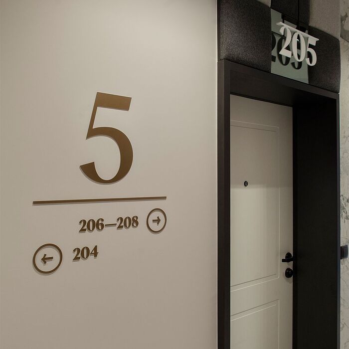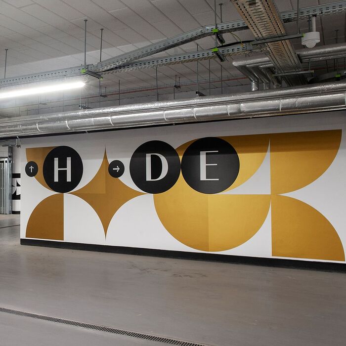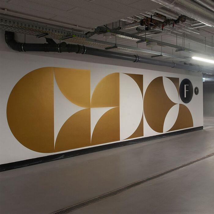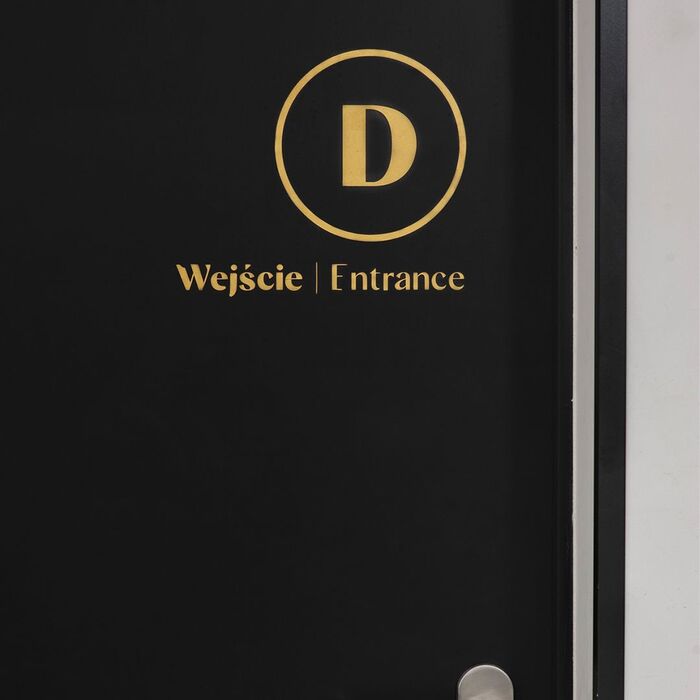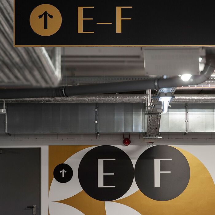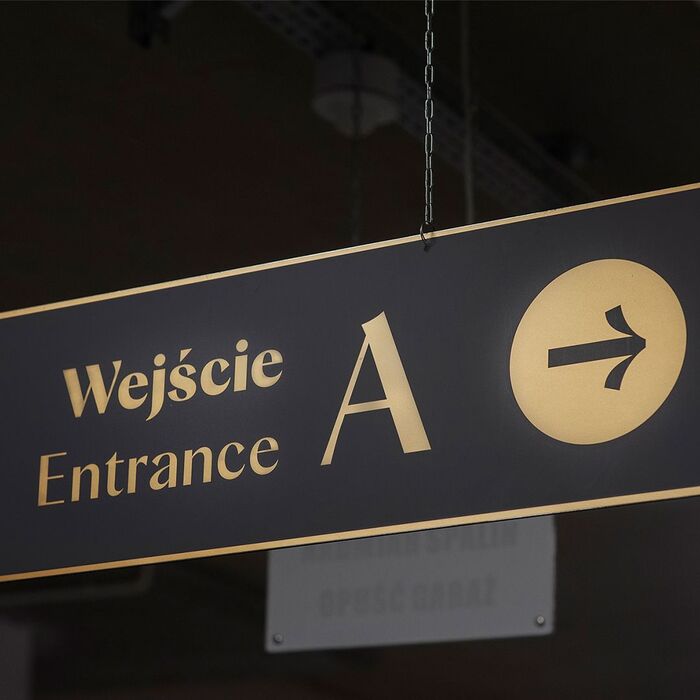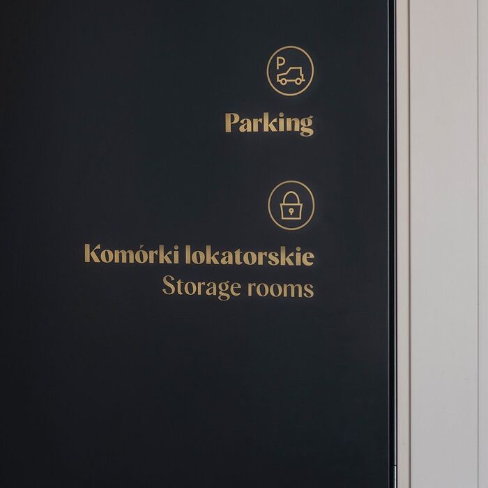 The main material appearing in the wayfinding is aluminium painted in gold colour. Elements of the wayfinding system are inspired by the DOKI logo and complemented by numerous mirrors. The circles in which, for example, floor numbers and directional arrows are framed also refer to the brand's sign.Large-format but elegant graphics have appeared in the underground car park spaces. Their colour palette continues the use of black and gold colour scheme.