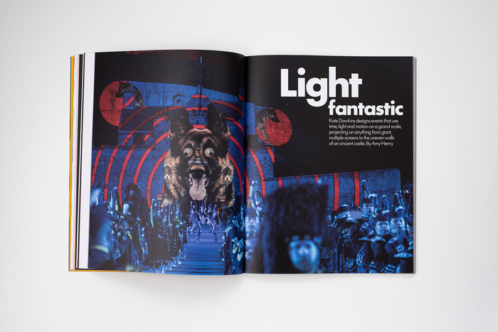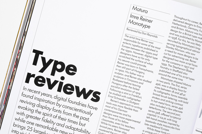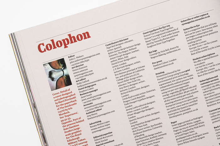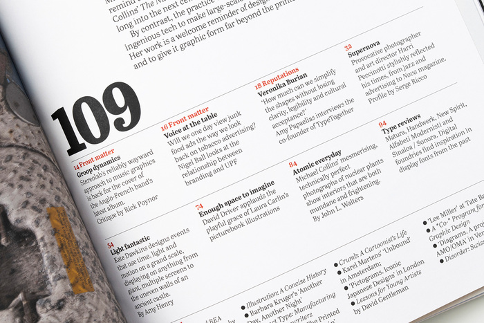Eye 109 uses Futura®100 for headlines, body text, and certain graphics in the issue, while Abril is used as for headlines and body text in many of the issue’s regular sections.
