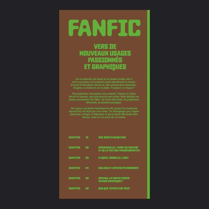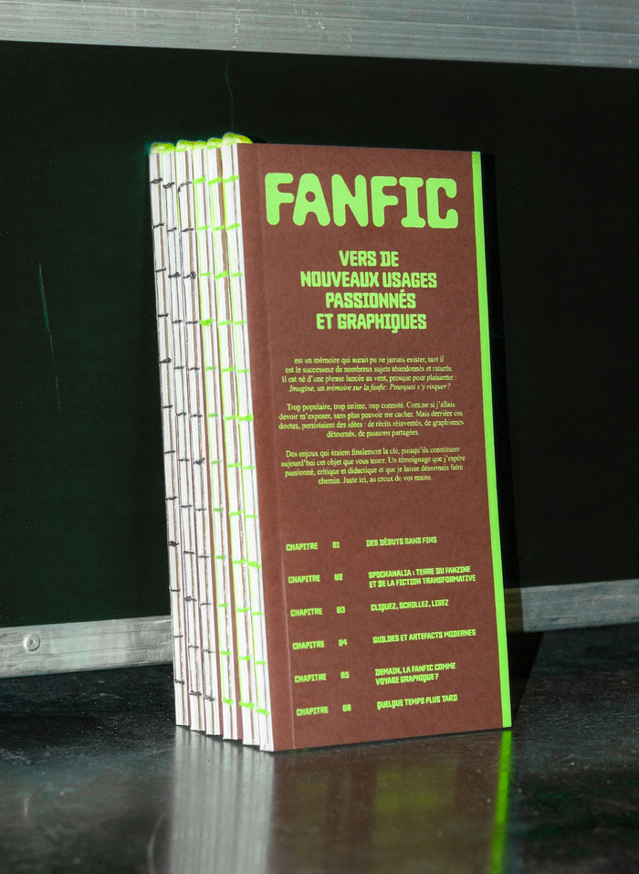 This thesis might never have existed, as it is the successor to many abandoned and discarded topics. It was born from a sentence thrown out into the wind, almost as a joke: Imagine, a thesis on fanfic. Why take the risk? Too popular, too intimate, too loaded with connotations. As if I were going to have to expose myself, no longer able to hide. But behind these doubts, ideas persisted: reinvented stories, reappropriated graphics, shared passions. These issues were ultimately the key, since they now constitute the object you are reading. A testimony that I hope is passionate, critical, and educational, and that I now leave to its own devices. Right here, in the palm of your hands.