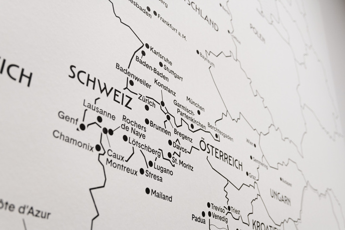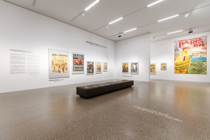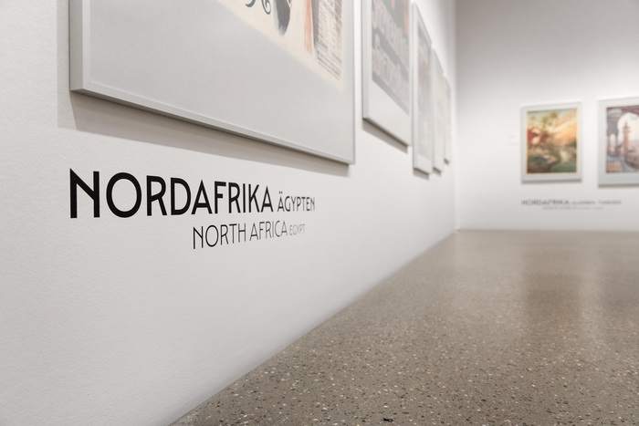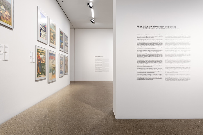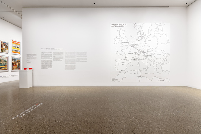 From luxurious destinations in the 19th century to the dynamic advertising posters of the 1920s and 30s to modern airline series and fictional NASA travel posters from 2019, the motifs span the development of travel as a desire and a vision. The exhibition Ferne Länder, Ferne Zeiten / Faraway Countries, Faraway Times at the Museum Folkwang is accompanied by literary works by Felicitas Hoppe, who sheds new light on longing and wanderlust in exclusive “literary journeys of the mind.” The exhibition, curated by René Grohnert, is complemented by a large wall graphic in the form of a map that clearly visualizes all the tourist destinations presented. We created wall and floor lettering that typographically references the period in which the posters were created. These were supplemented by a large wall graphic in the form of a map that clearly visualizes all the tourist destinations presented.