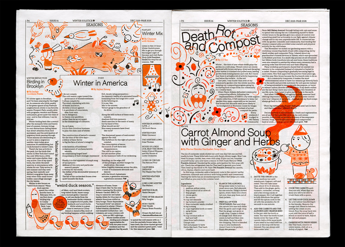 The Field Meridians’ Observer is a printed, quarterly neighborhood newspaper highlighting local news and seasonal perspectives. Published at the turn of each season and distributed for free to the Crown Heights community, local neighborhood stockists include the Brower Park Library (155 Brooklyn Ave) and Another World (629 Nostrand Ave) and The Word is Change (368 Tompkins Ave). The first issue is tied to the winter solstice, including a warming soup recipe, a piece on the joy of winter birding, and a calendar of the season’s best activities. A digital copy of the first issue is available here.
