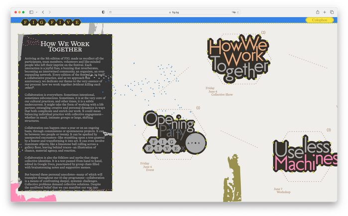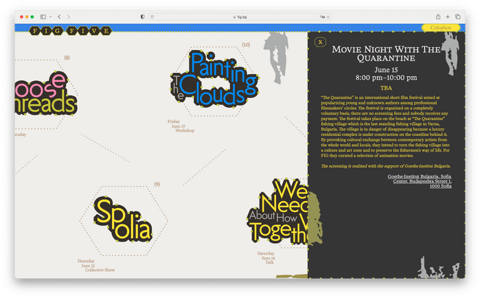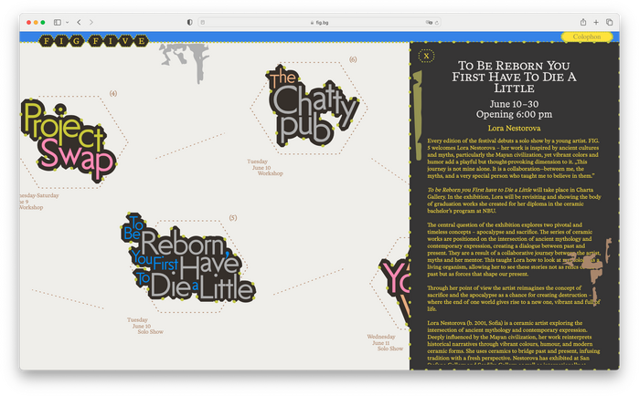 The fifth edition of FIG. (Festival for Illustration and Graphics) took place in Sofia, Bulgaria. The festival hosted numerous exhibitions, group shows, talks, workshops, concerts and screenings. The identity and graphics were created by Velko Kalchev, who came up with a colorful collage of cut-and-paste-style visuals, blended with type and dotted lines. The festival’s website adds a level of playfulness with animated dotted lines. The design uses the chunky Montagu Slab for the logo and Good Direction Sans for headlines. The text font is HAL Timezone by HAL Typefaces, nicely making use of its small caps.