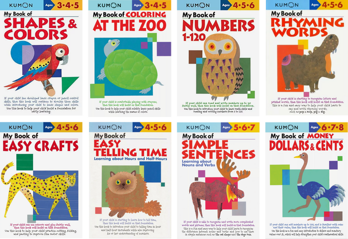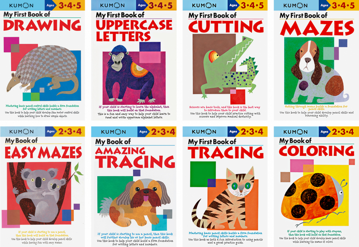 My First Book of… is the title of Kumon’s early‑learning workbook series designed to build pre‑writing and fine‑motor skills for young children. The books start with introducing basic drawing motions through step‑by‑step activities that help children practice pencil control, shape recognition, and hand–eye coordination, and then move on to more advanced topics. There are tiers for ages 2–4, 3–5, 4–6, 5–7, and 6–8 years. Not all books include “First” in the series title.