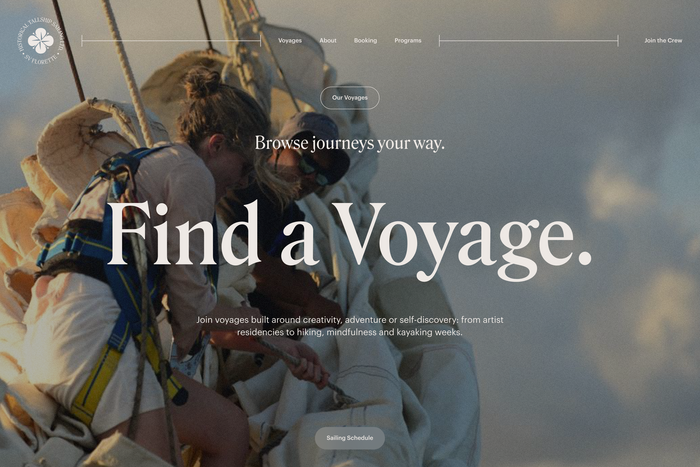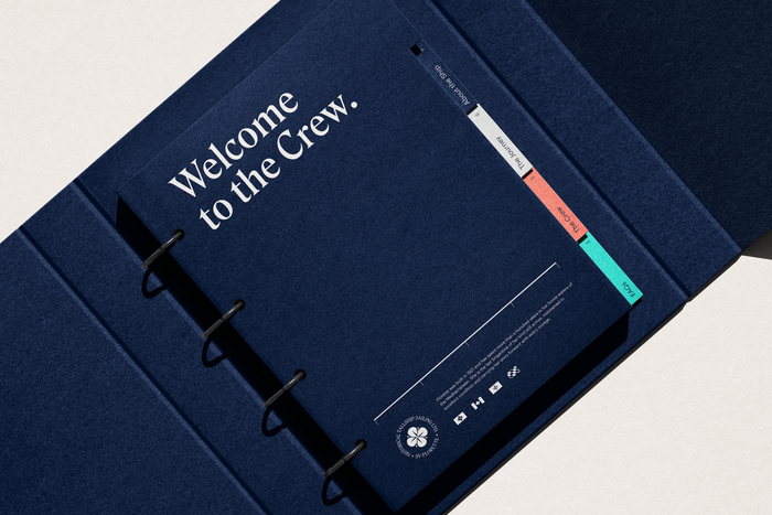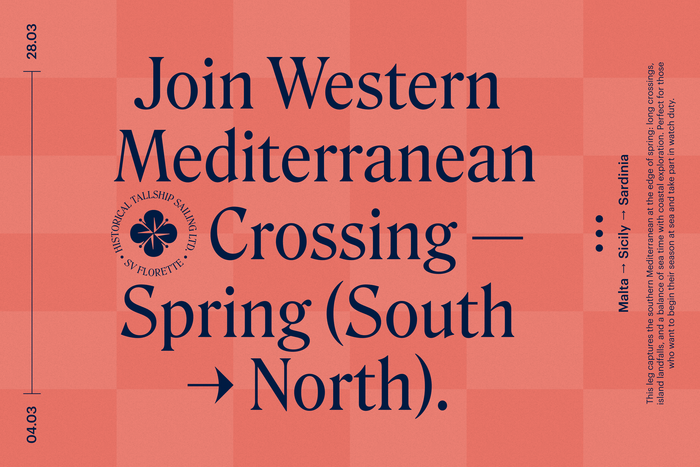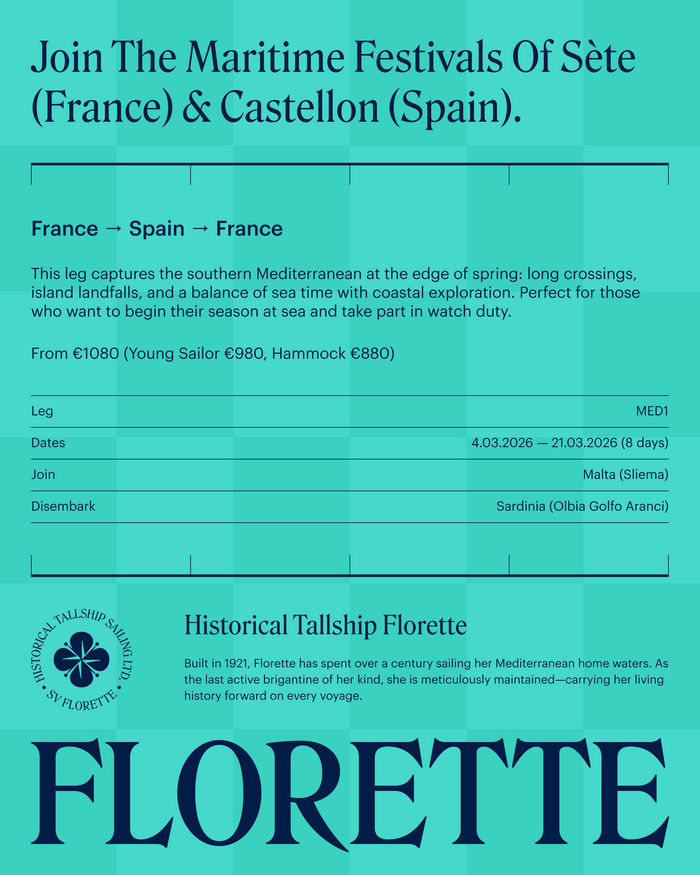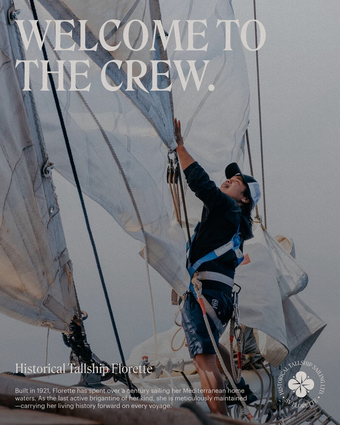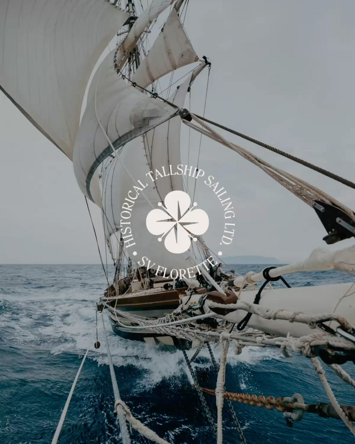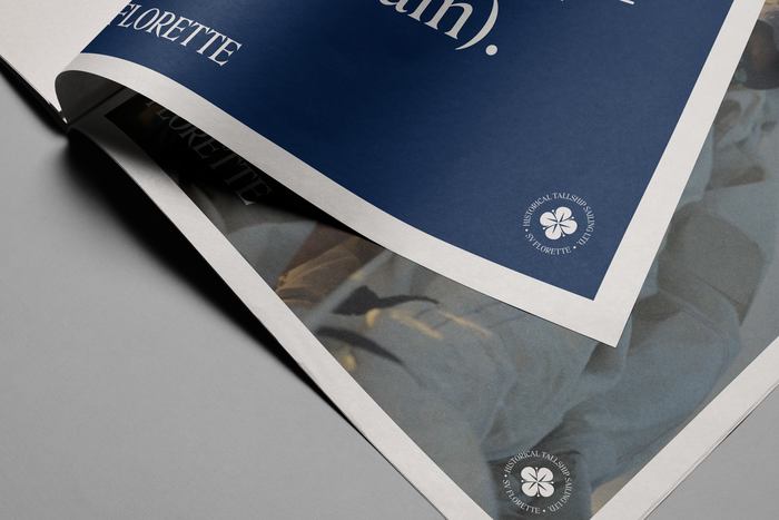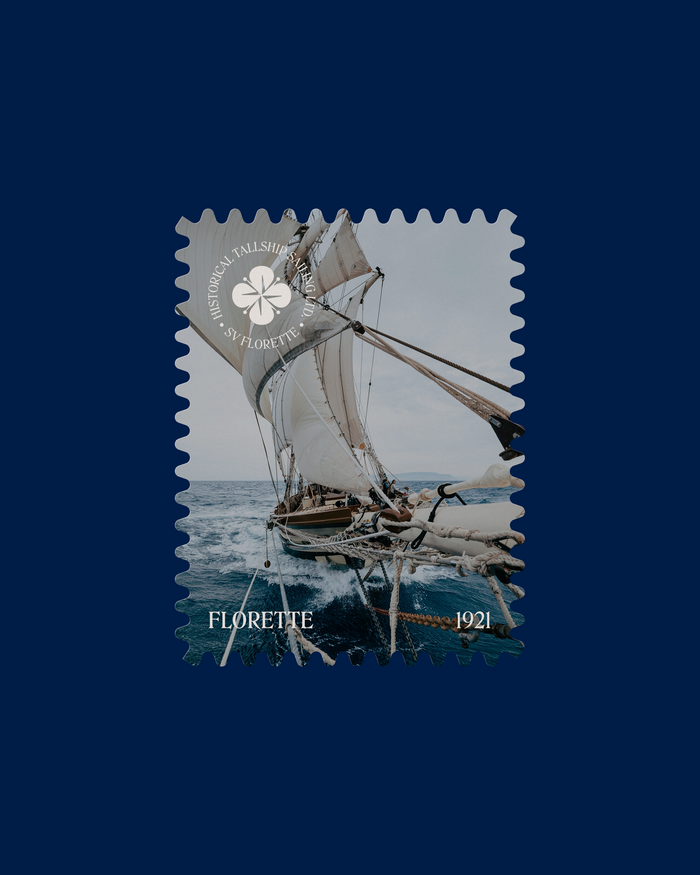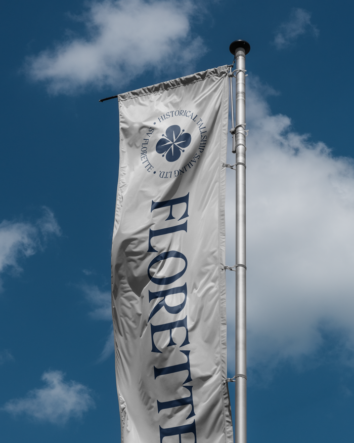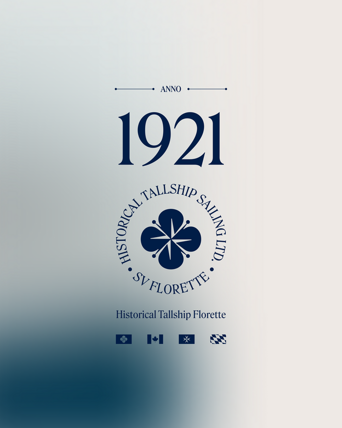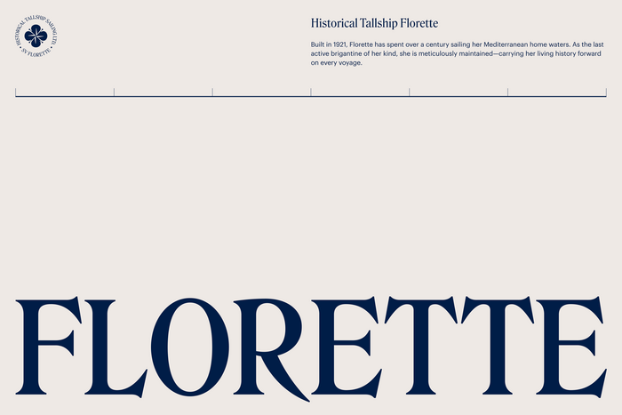 The brand idea draws from the meaning of Florette—“flower” in Italian—using a floral motif as the foundation for the new symbol. This form is combined with a wind rose, linking growth and beauty with journey, navigation, and direction at sea. The color palette balances deep navy blue, inspired by open water, with the light, sail-like tones of canvas and wind-filled cloth, creating an identity that feels both poetic and purposeful.