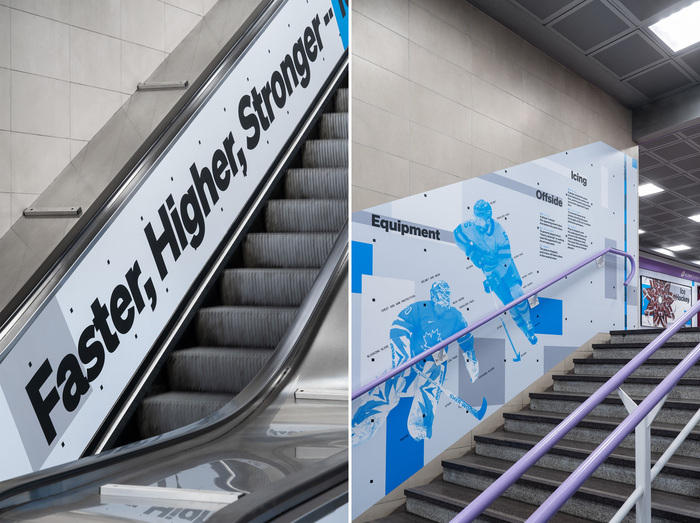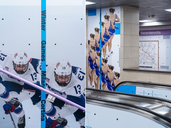 Through a series of large-scale illustrations, the installation reveals key movements, rules, historical facts, figures and the stories of champions. Drawing on images selected from the Olympic Museum’s collections and reinterpreted in a graphic style inspired by Futurismo, the metro station becomes a place of discovery woven into everyday life.