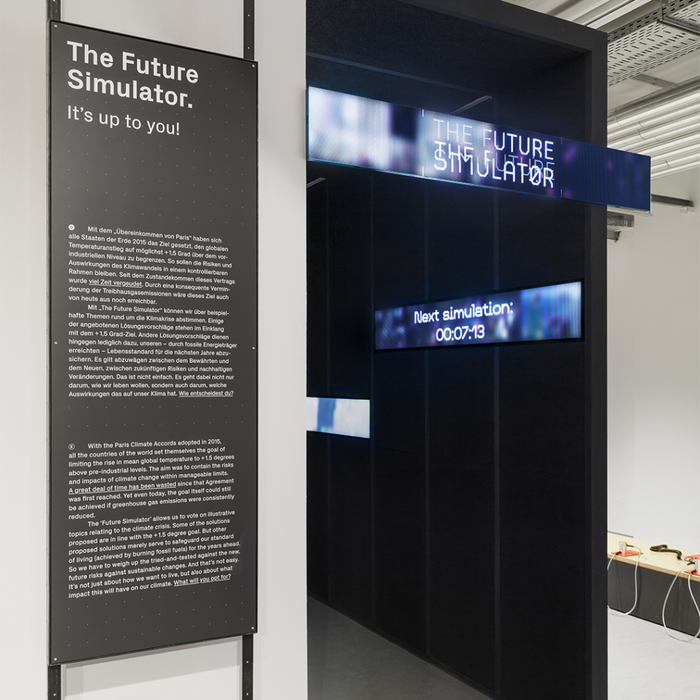 The Future Simulator is an immersive installation allowing visitors to make decisions on climate-related topics and experience the consequences for humanity.