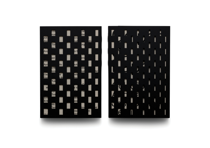 The book seeks to reflect this same spatial and poetic logic in its graphic and material structure. The dust jacket, featuring a die-cut pattern derived from the architectural design, acts much like the perforated walls of the exhibition: at times revealing, at others concealing images and information, creating layers of reading and points of contact between content and materiality. The choice of papers was fundamental to support this concept.