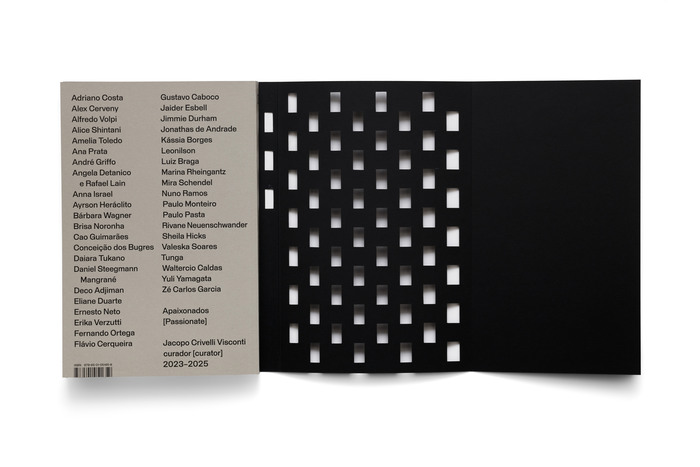 These choices align with the architectural concept of Galpão da Lapa, a former 19th-century industrial warehouse in São Paulo’s Lapa neighborhood, repurposed to host temporary exhibitions of Brazilian contemporary art. The publication is part of a bilingual series (Portuguese and English) documenting the exhibitions held in the space. Each volume was designed to establish a specific graphic relationship with the curatorial and spatial proposal of its show. In this edition, the book assumes a more tactile, sensorial character, functioning not only as a visual documentation, but as a physical object that carries, within its materiality and graphic structure, the concept of the exhibition and the identity of the space itself.