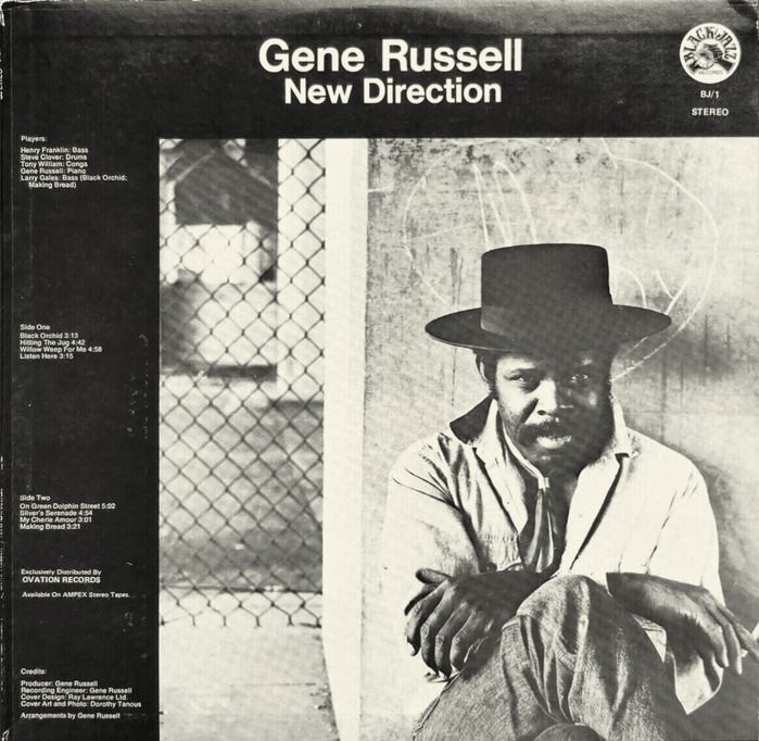 Gene Russell (December 2, 1932 – May 5, 1981) was an American pop, jazz, and soul keyboardist and the founder of the 1970s Oakland-based label Black Jazz Records. Born in Los Angeles, he began studying piano at a young age and later attended Juilliard. Throughout his career, Russell performed and recorded with several jazz artists, including Miles Davis, Rahsaan Roland Kirk, Zoot Sims, William (Bill) Hillman, Dexter Gordon, and others. He also composed music for film and television and worked as an actor. Russell released two hard bop albums in 1967, and his third album, New Direction (1971), was the first release on his Black Jazz Records label. Photography for this cover is by Dorothy Tanous with the cover and packaging design by Ray Lawrence.