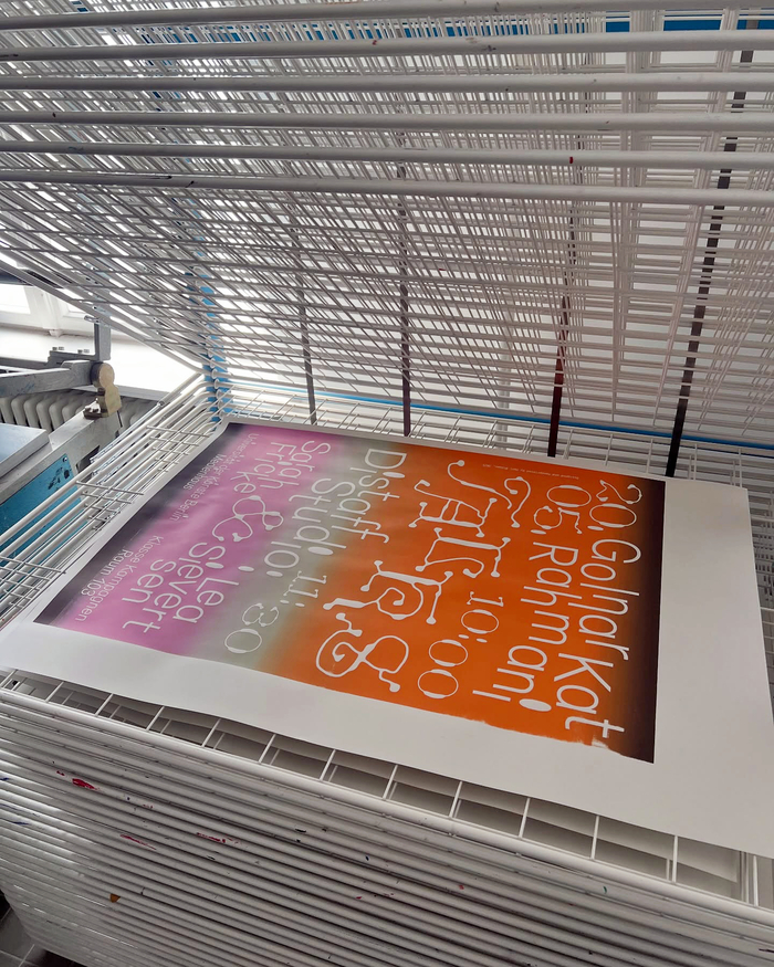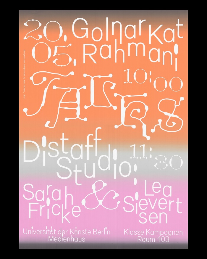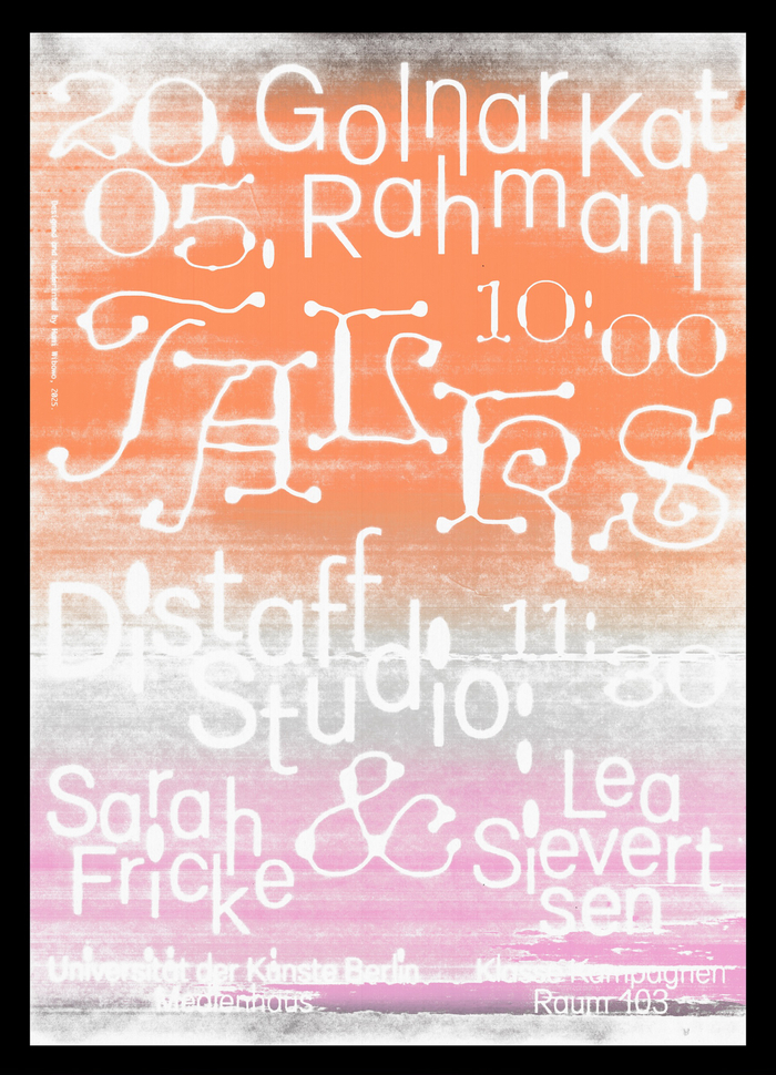 Posters designed by Hani Wibowo for the design talks with Golnar Kat Rahmani and Sarah Fricke & Lea Sievertsen of Distaff Studio at UdK Berlin’s Klasse Kampagnen.