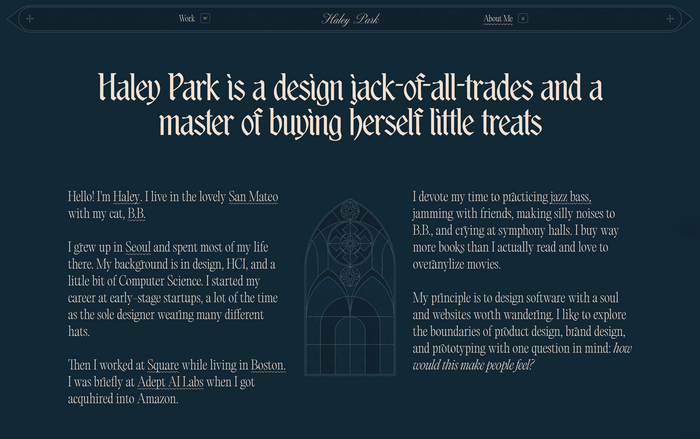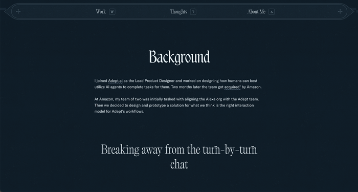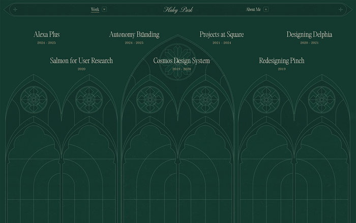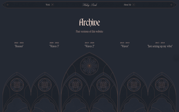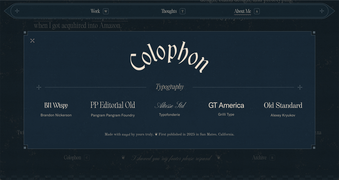 The 2025 version of my personal website uses BN Wispy and Editorial Old as the primary fonts. Altesse and Old Standard serve in supporting roles. GT America is the text typeface for project descriptions. The decorative crosses and the fleurons in the footer are taken from Bodoni Classic Ornaments.