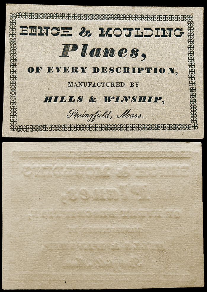 Business card (4⅝″×2½″) by Hills & Winship, manufacturers of “bench and moulding planes of every description”. A quick dig finds that this partnership likely began in 1832, the assumed date that this business card was created. The 18pt Caslon Italian line at the top has especially crisp edges all around, clearly from metal type, perhaps brand new type.