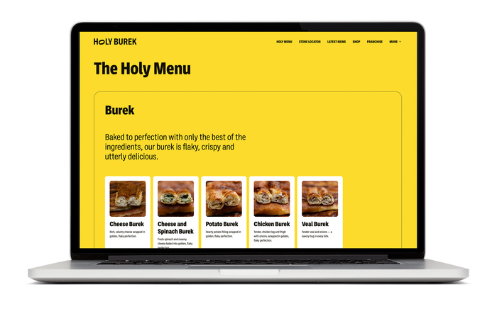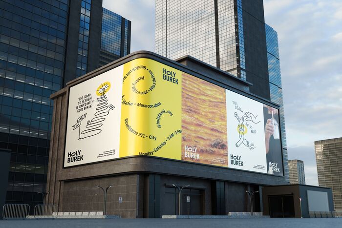 A burek is a traditional baked pastry with a thin, flaky crust filled potato, cheese, or meat, often served with a yogurt drink called ayran. Holy Burek was founded to “reintroduce the beloved Balkan burek to a new generation.” With the help of a lively, witty branding system from Zagreb-based Studio Hrvatin, it’s established an international presence, with locations in Croatia, France, the US, and the UAE. Art direction and illustration by Iva Hrvatin.