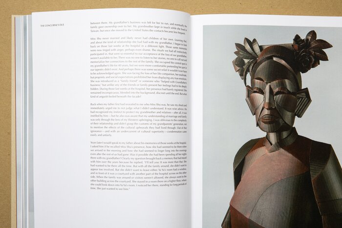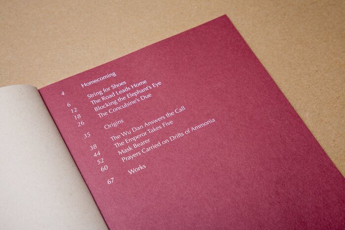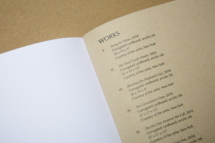 The book takes its cues from Warren’s process. The cover features a view of the sculpture The Road Leads Home printed on a natural paper similar to cardboard. Two essays about Warren’s background and artistic process are produced in white ink on dark red paper to separate them out from the art-specific essays. Details of sculptures interact with the text, which is framed with generous margins for readability. The back cover features an embossed cicada — a recurring element in Warren’s work.