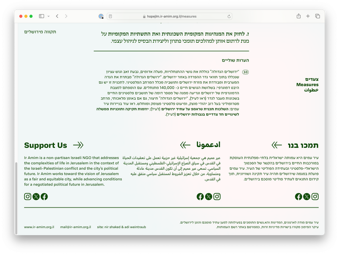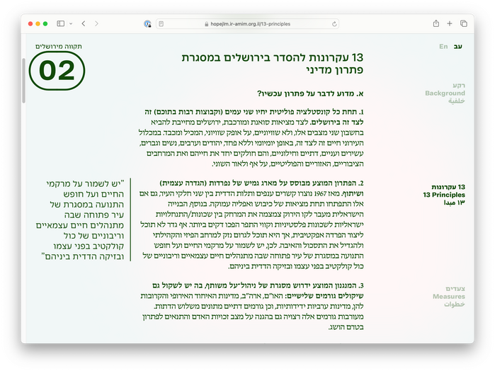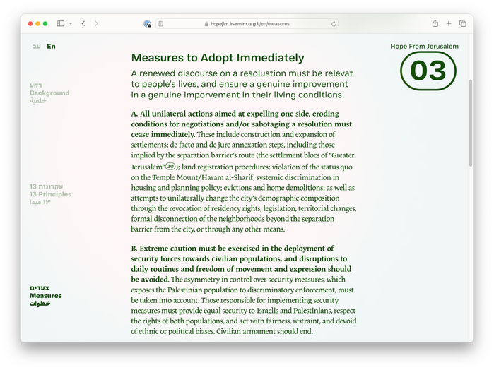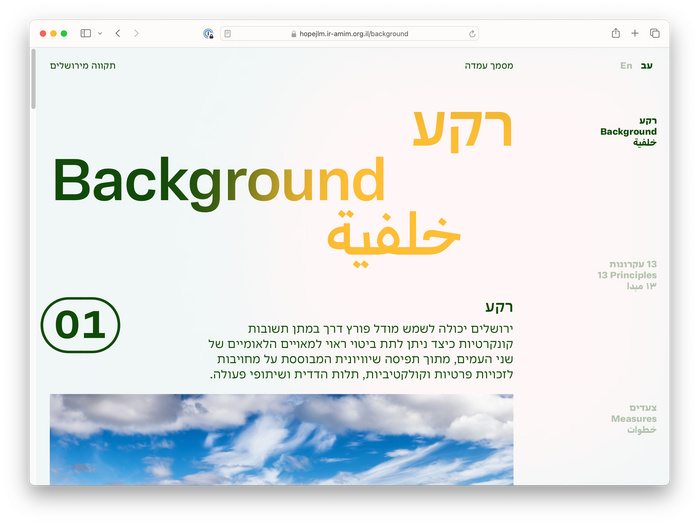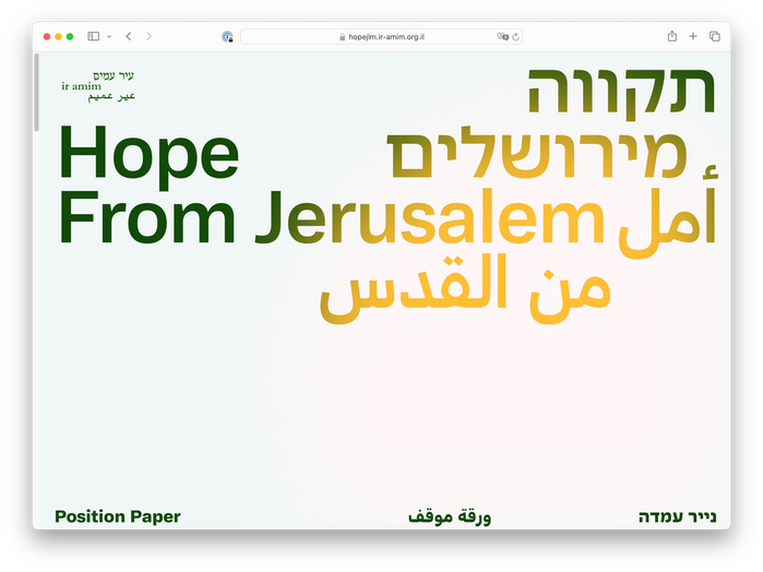 The website uses a color palette that delicately references the various identities and cultures that make up the city of Jerusalem, against a simple typographic scheme comprised of two multilingual font families. The website is primarily bilingual (English/Hebrew), but makes use of Adapter’s Arabic character set throughout the headings in both language versions of the website.