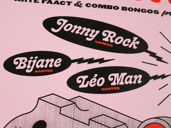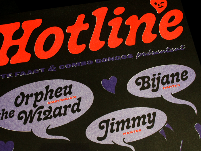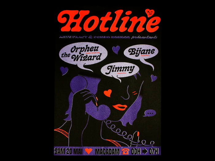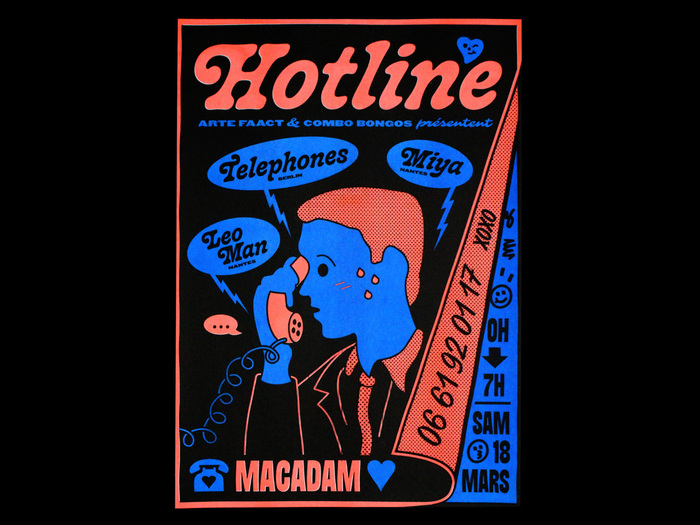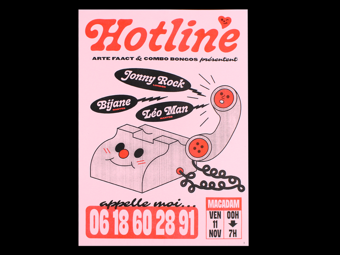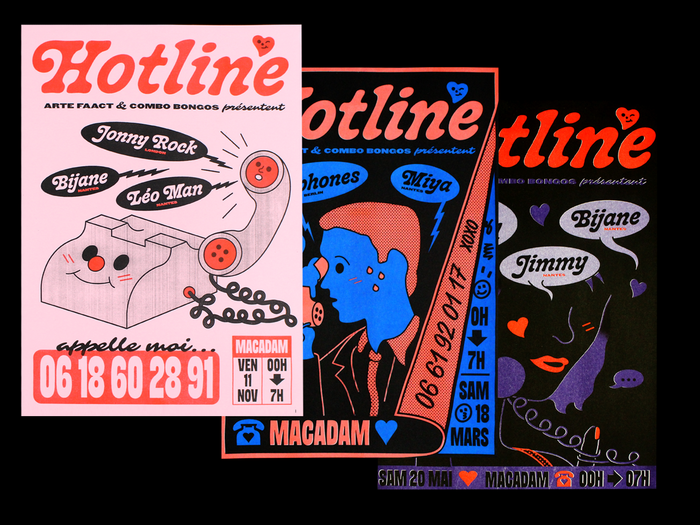 Series of posters for Hotline, a succession of three events organized by Arte Faact and Combo Bongos at a local club in Nantes called Macadam. The identity had to be inspired by the retro flyers of sex chat line advertising, using a real phone number to give the practical informations for the event.