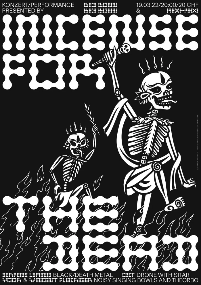 Poster for a heavy metal concert and performance event at Bad Bonn, in collaboration with Nathan Meyer. The aim was to design a poster that was coherent with the event, while subverting common heavy metal clichés. To provide a contrast to the handcrafted feel of the linocut, the Metaballs typeface by Maxitype introduces more geometric forms, subtly referencing the bone motif of the illustration.
