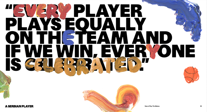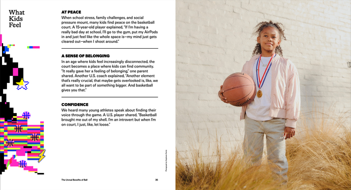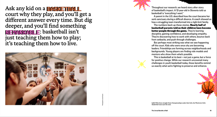 The Foundation uses Focal and Marist also for its branding – which was directly inspired by the design of the report. Focal is paired with different typefaces and illustrated letters to give an expressive and vibrant view on where basketball is with the youth around the world. It also stands a lone in some more somber instances of the report and the foundations branding.