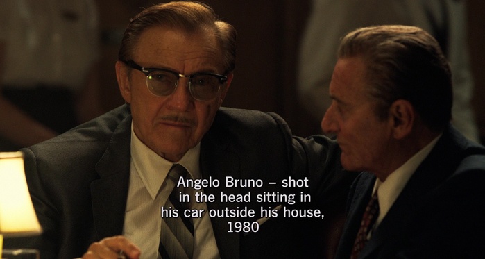 Title sequence. “I Heard You Paint Houses” was also Scorsese’s preferred name for the movie; that’s why it appears in the beginning.