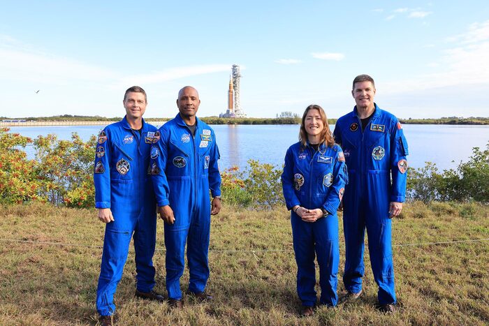 The crew of Artemis II pose with the Space Launch System and Orion spacecraft. Jeremy Hansen is at far right, with the patch visible on his uniform.