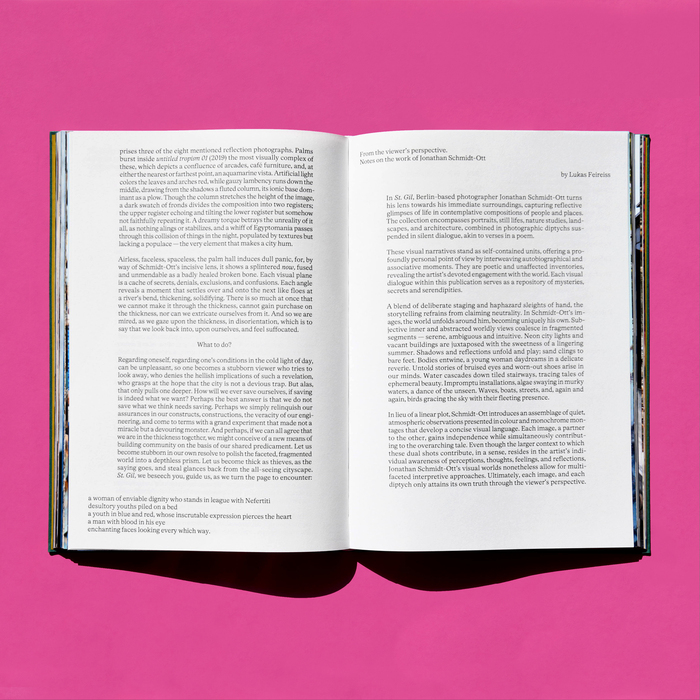 In St. Gil, Berlin-based photographer Jonathan Schmidt-Ott turns his lens towards his immediate surroundings, capturing reflective glimpses of life in contemplative compositions of people and places. The collection encompasses portraits, still lifes, nature studies, landscapes, and architecture, combined in photographic diptychs suspended in silent dialogue, akin to verses in a poem. These visual narratives stand as self-contained units, offering a profoundly personal point of view by interweaving autobiographical and associative moments. They are poetic and unaffected inventories, revealing the artist's devoted engagement with the world. Each visual dialogue within this publication serves as a repository of mysteries, secrets and serendipities.