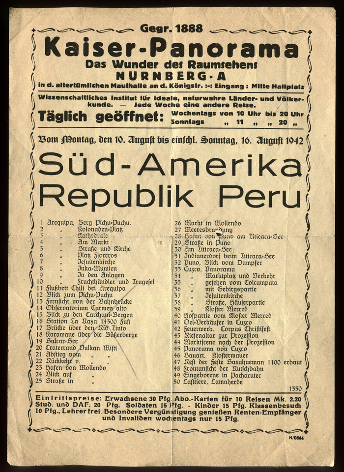Each week, the Kaiser-Panorama (est. 1888) in the Mauthalle presented a different virtual journey. This time, visitors could view stereoscopic glass slides depicting fifty three-dimensional scenes from the Republic of Peru in South America, from the Pichu-Puchu [sic!] to a herd of llamas. Students and DAF members paid a reduced entry fee; soldiers, children, seniors and disabled persons even less.