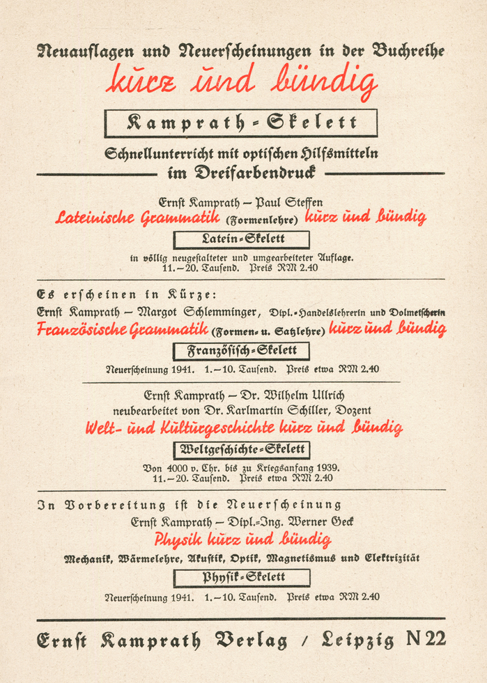 Print ad for new releases and reissues in the educational book series Kamprath-Skelett – kurz und bündig (“briefly and concisely”) by Ernst Kamprath Verlag, Leipzig. The listed titles include “quick lessons with visual aids in three-color printing” for Latin and French grammar, world and cultural history, and physics.