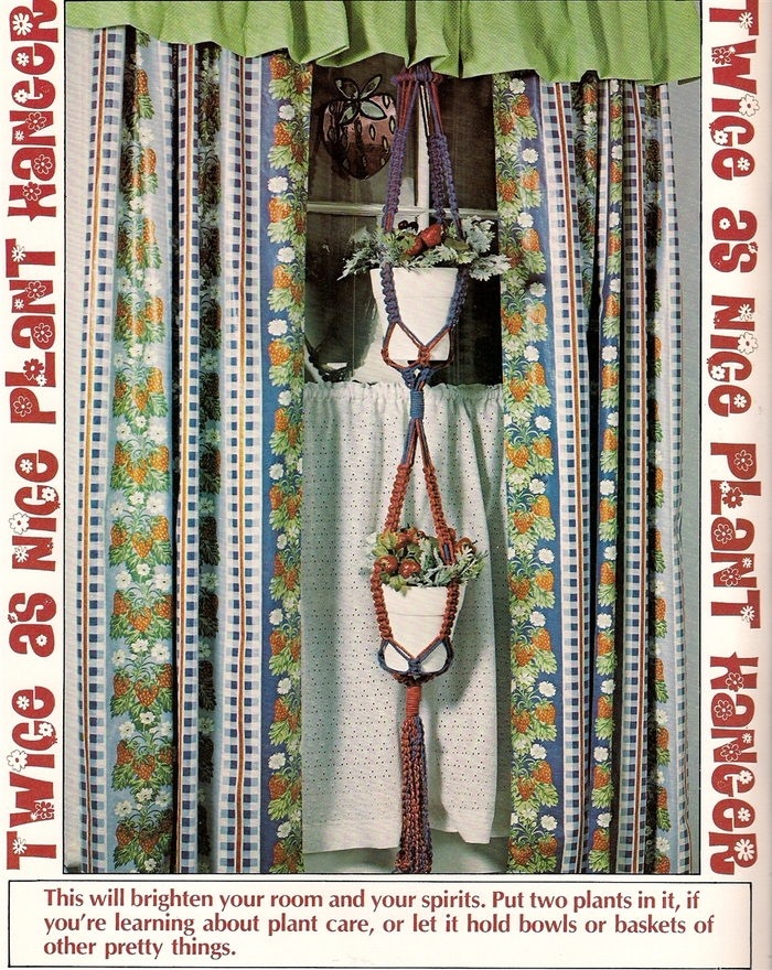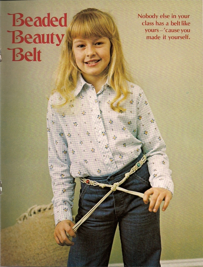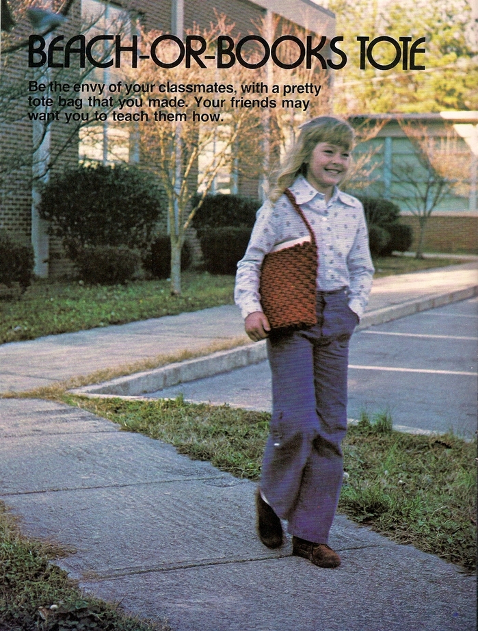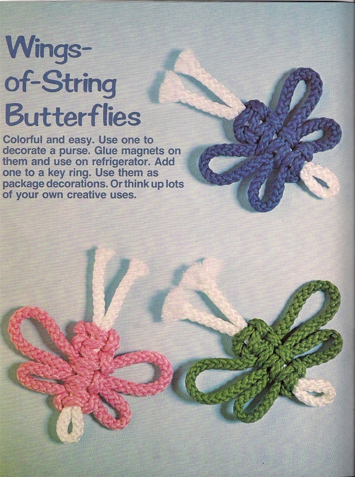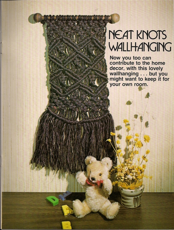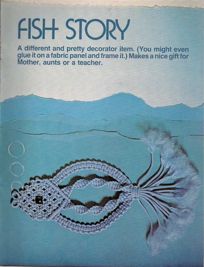 On 23 pages, the DIY book presents patterns titled Neat Knots Wallhanging, Wings of String Butterfly, Fish Story, Twice as Nice Plant Hanger, Beaded Beauty Belt, Beach or Books Tote, Jump Ropes, Message Center, Mr. Happy, Ring Around a Towel, and Pretty Hang-up.