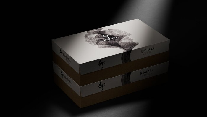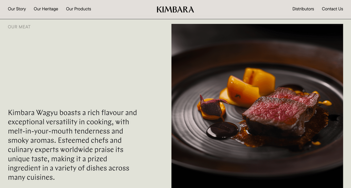 Branding for Kimbara premium waygu, Japanese-style beef from Kimberly, Australia. The design is minimalist, mostly black and white, and relies on typography and calligraphy to make it distinctive. Two display typefaces are combined: Ergon for the main wordmark and Chap for titles and headlines.