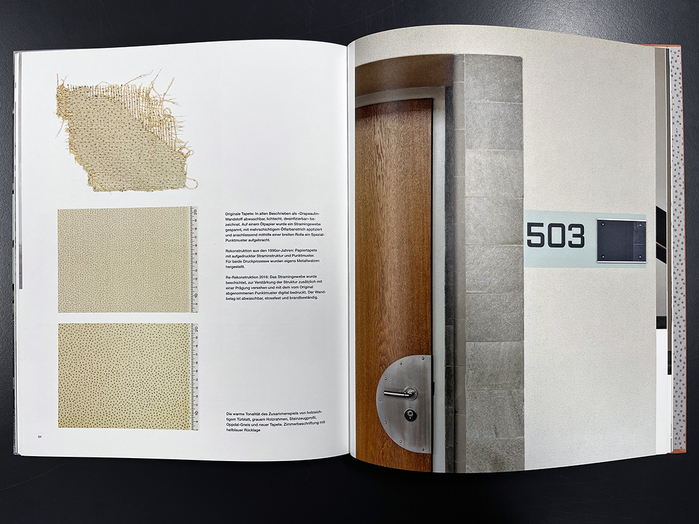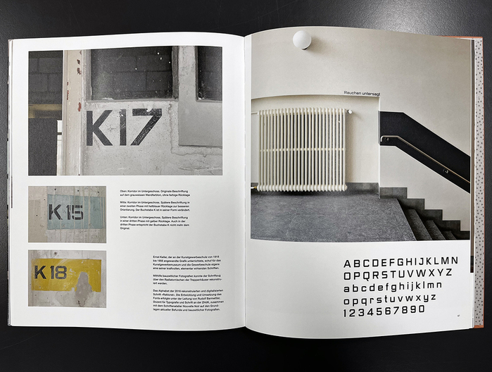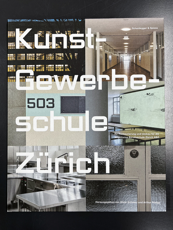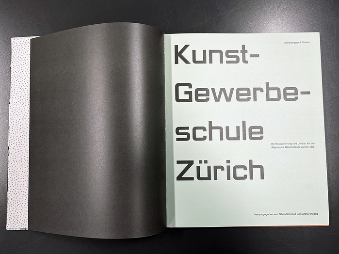 This custom version of Rektorat is also used for the book shown here. It’s about the re-restoration and conversion of the modernist building for the Allgemeine Berufsschule Zürich (ABZ, General Vocational School Zurich). Edited by architects Silvio Schmed and Arthur Rüegg and designed by Jean Robert and Kati Durrer, it was published by Scheidegger & Spiess (translated):