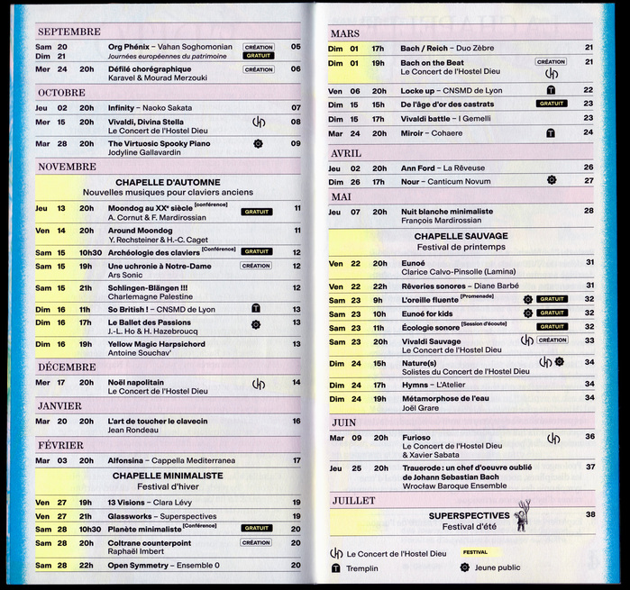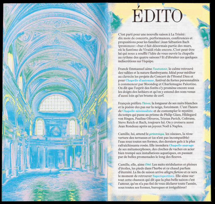 Visual identity for the second season of La Trinité, the result of a collaboration between Le Concert de l’Hostel Dieu and Superspectives, brought together within the Lyon Trinité Musique association. Together, they inaugurate a new stage dedicated to baroque and irregular music, set within the historic setting of the Chapelle de la Trinité in the heart of Lyon.