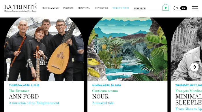 The arch, the central motif of the new visual identity, unfolds through its various applications. It embodies La Trinité’s ambition to create a dialogue between early repertoire and contemporary creation.