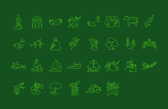 At the core of the identity is the icon system, inspired by the Spoykanal, which runs through Kleve and accompanies people from one place to another. The modular icons are formed from continuous lines that reveal their meaning only at second glance. This connecting principle runs like a blue thread through all elements of the corporate identity, ensuring that orientation, content, and the identity of the garden show work together consistently. The system is complemented by the typeface Flink Neue which supports the icons in an informative way while reinforcing their dynamic lines through its geometric form and solid presence. The color palette highlights water through blue and introduces vibrancy, flowers, and activity through its secondary colors.